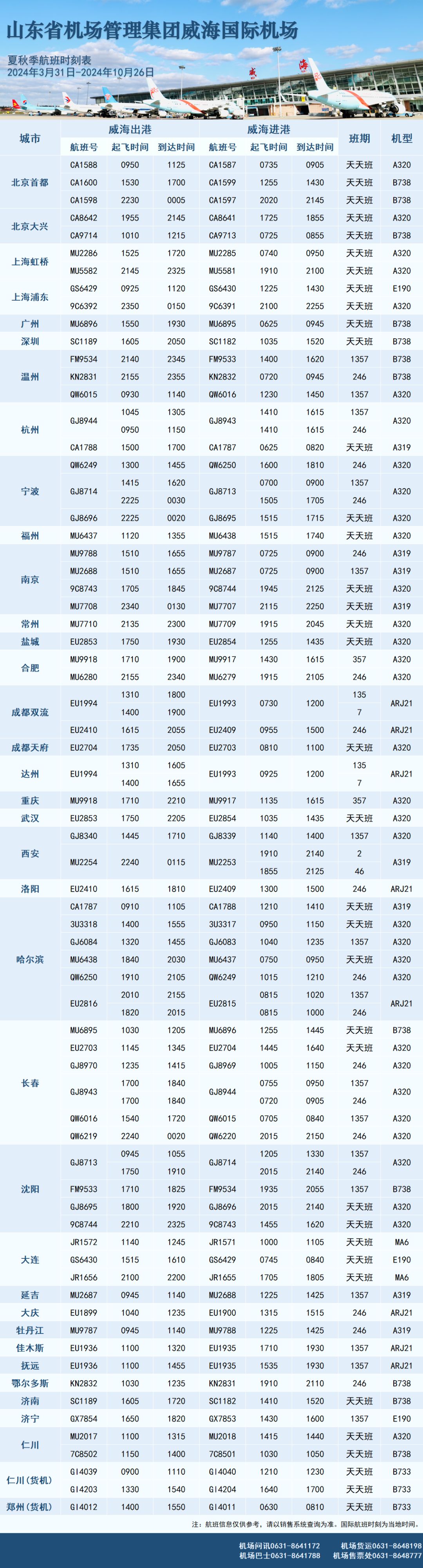 3U3317航班由四川航空執(zhí)飛,9:50由哈爾濱起飛,11:50抵達威海,14:00由威海起飛,15:55抵達哈爾濱,每天運營1班,執(zhí)飛機型為A320,這是威海機場與四川航空合作運營的首條航線,至此,在威海機場運營的航空公司增至15家。常州是威海機場新開航點。截至目前,威海機場通達航點達到35個。威?!V莺桨?9:15由常州起飛,20:45抵達威海,21:35由威海起飛,23:00抵達常州,每天運營1班,執(zhí)飛機型為A320。