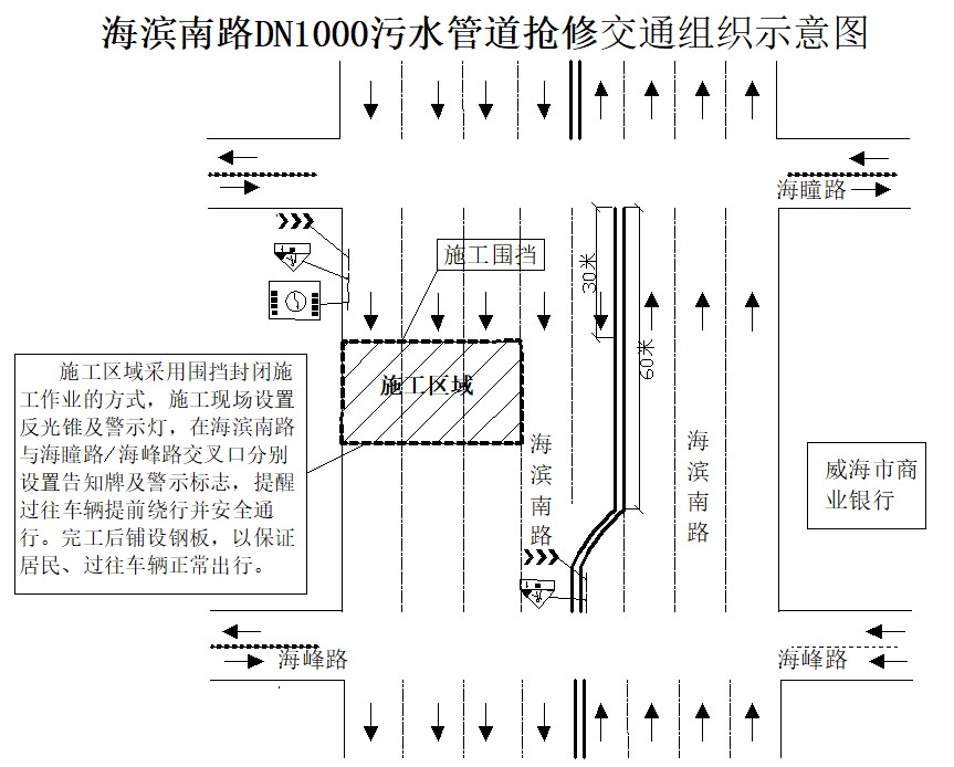 因海濱南路(海瞳路口向南40米)污水管道故障,經(jīng)相關(guān)部門批準(zhǔn),水務(wù)集團(tuán)于10月29日開始對該處管道進(jìn)行維修,為確保工程順利實(shí)施及施工期間的交通安全,現(xiàn)公告如下: