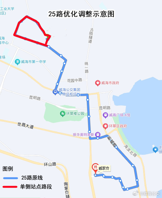 威高花園樞紐站改為途經(jīng)站,調(diào)整后,25路改為戚家夼環(huán)行運行,由戚家夼發(fā)車,按原線運行至威高時光城站點后,改行宮松嶺路、遠遙墩路、臥龍山路、宮松嶺路按原線路返回戚家夼站點。威高花園區(qū)域站點調(diào)整為單側(cè)停靠。