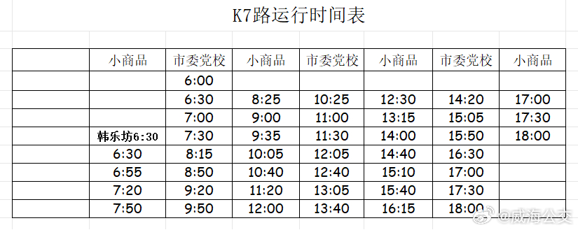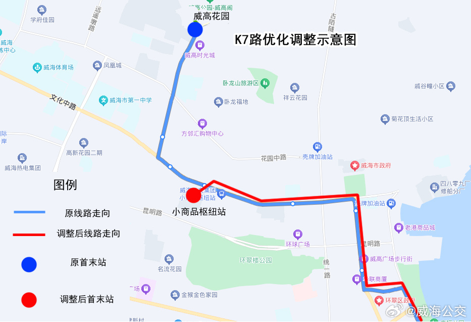 調(diào)整后,K7路由市委黨校發(fā)車,按原線路運行至小商品樞紐站,取消威高花園、神道口、市民卡環(huán)翠服務中心、小商品市場4個站點。