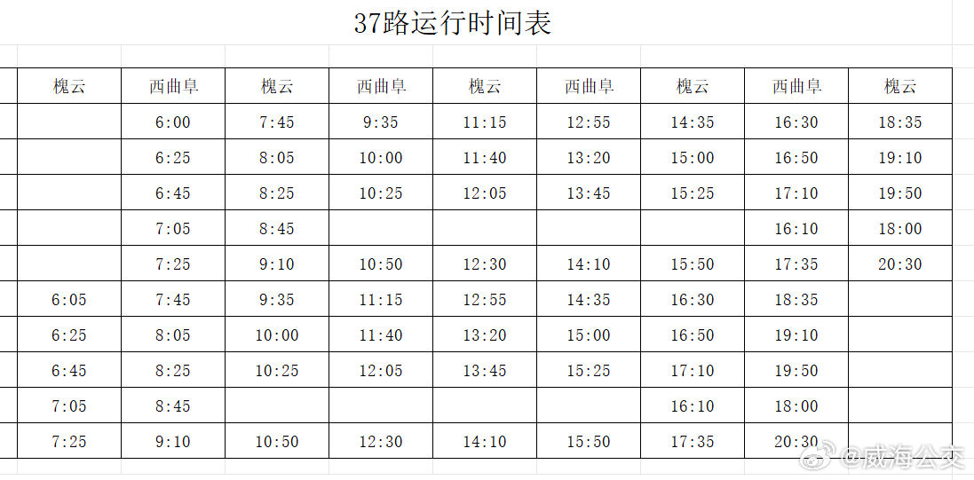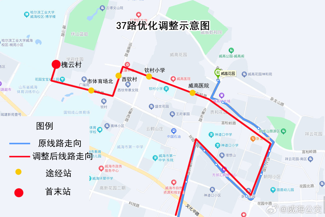 調(diào)整后,37路由西曲阜發(fā)車,按原線路運行至威高時光城站點,改行宮松嶺路、遠遙墩路、花園中路、福山路至槐云村站點,取消威高花園1個站點,增設威高醫(yī)院、欽村小學、西欽村、體育場北、槐云村5個站點。