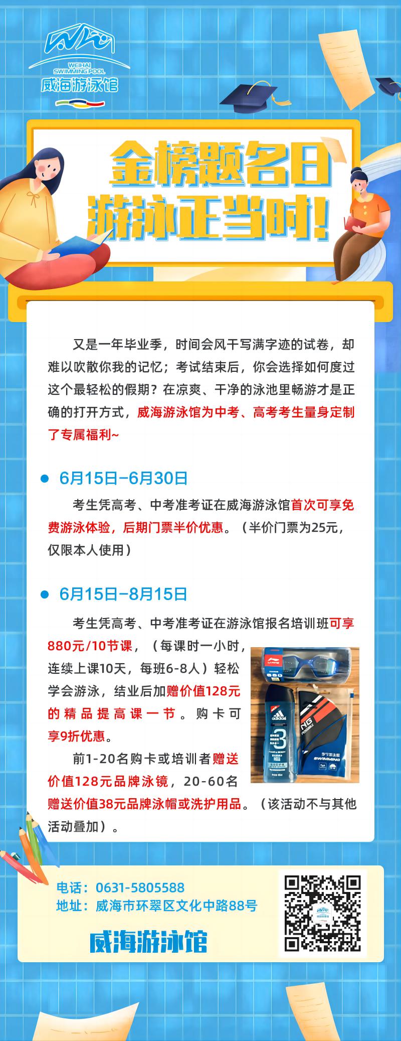 6月15日-6月30日考生憑高考、中考準(zhǔn)考證在威海游泳館首次可享免費(fèi)游泳體驗(yàn),后期門(mén)票半價(jià)優(yōu)惠。(半價(jià)門(mén)票為25元僅限本人使用)