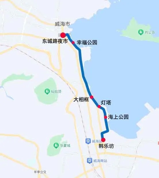 線路由東城路夜市發(fā)車,途經(jīng)大相框(市人社局東)、燈塔、海上公園(慶威花園)、韓樂坊東(經(jīng)區(qū)中國(guó)銀行)、韓樂坊(紅星美凱龍)、海上公園(慶威花園)、燈塔、大相框(市人社局東)、幸福公園后返回東城路夜市。