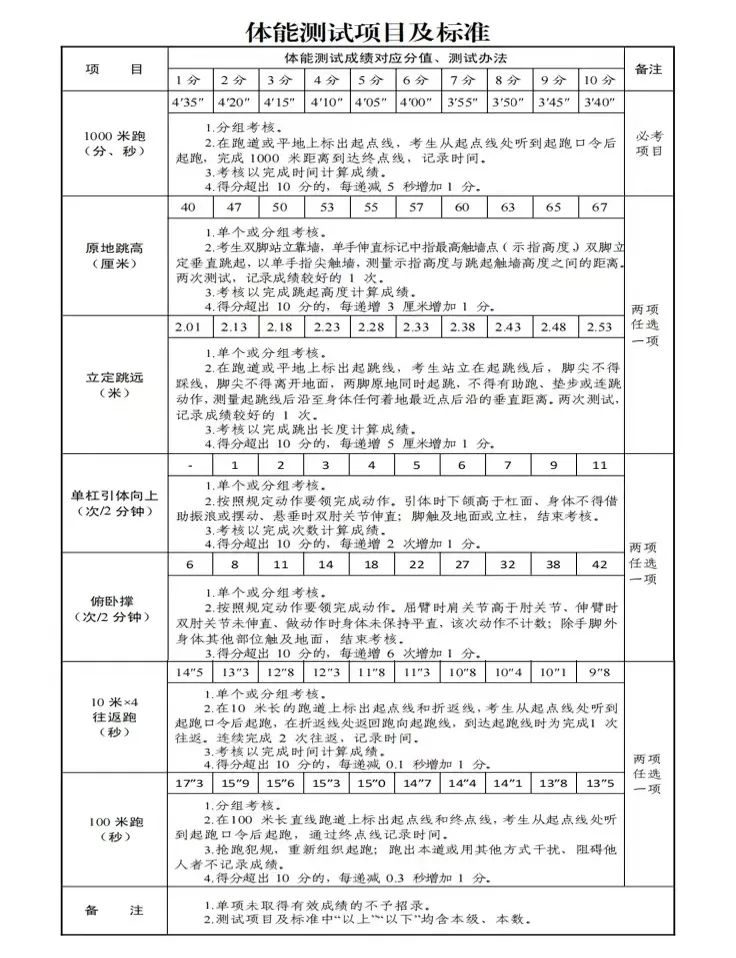 03體能、體型測(cè)試:標(biāo)準(zhǔn)參照《國(guó)家綜合性消防救援隊(duì)伍消防員招錄體能測(cè)試、崗位適應(yīng)性測(cè)試項(xiàng)目及標(biāo)準(zhǔn)》執(zhí)行??己隧?xiàng)目為:1000米跑必考項(xiàng);原地跳高、立定跳遠(yuǎn),兩項(xiàng)選一項(xiàng);單杠引體向上、俯臥撐,兩項(xiàng)選一項(xiàng);10米×4往返跑、100米跑兩項(xiàng)選一項(xiàng)。主要考察招收對(duì)象肌肉力量、肌肉耐力和爆發(fā)力等。