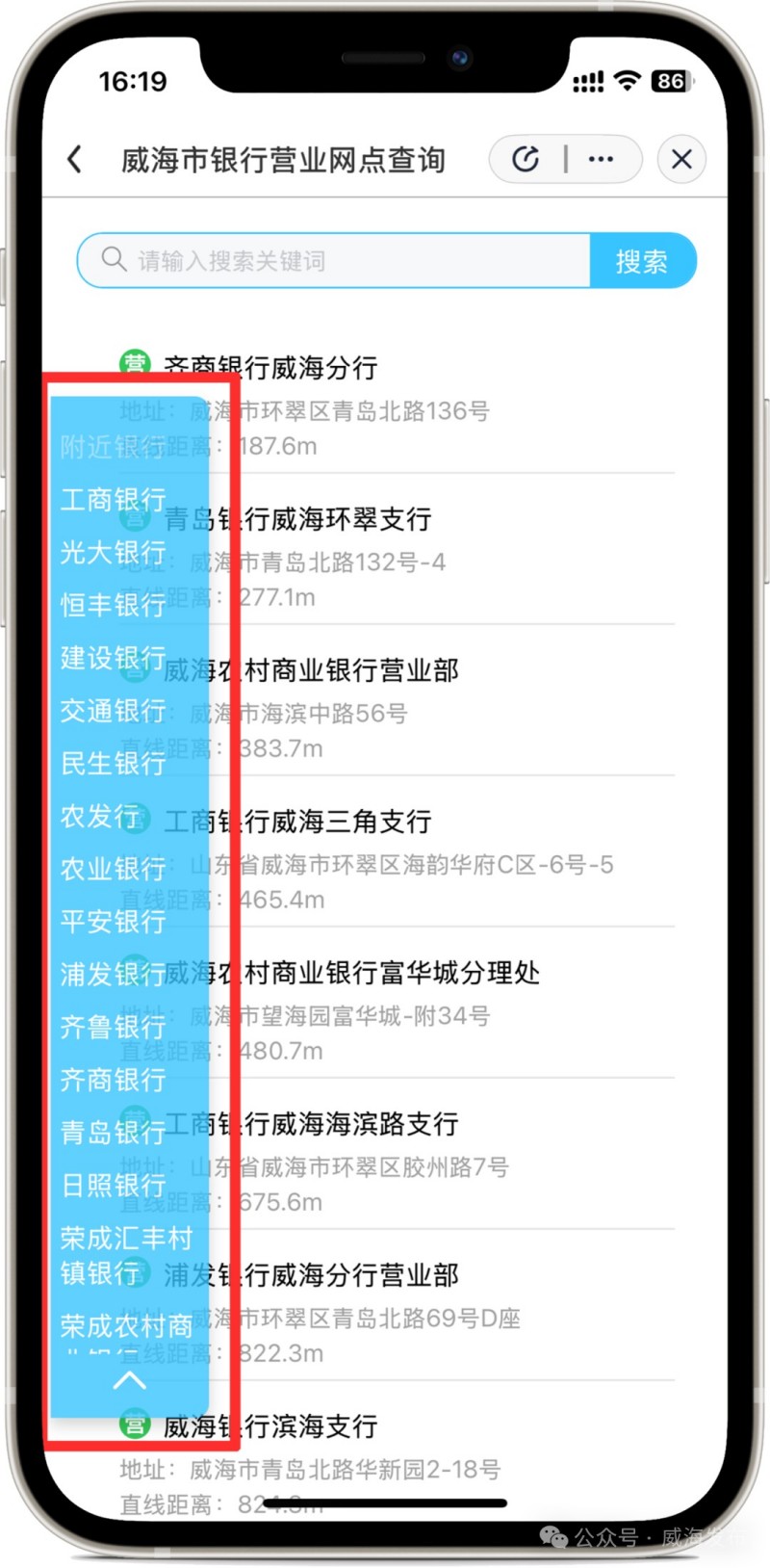 進(jìn)入“愛山東”APP后,在首頁左上角選擇進(jìn)入“威海市”,在搜索框搜索關(guān)鍵詞“銀行營業(yè)網(wǎng)點”,點擊進(jìn)入應(yīng)用。