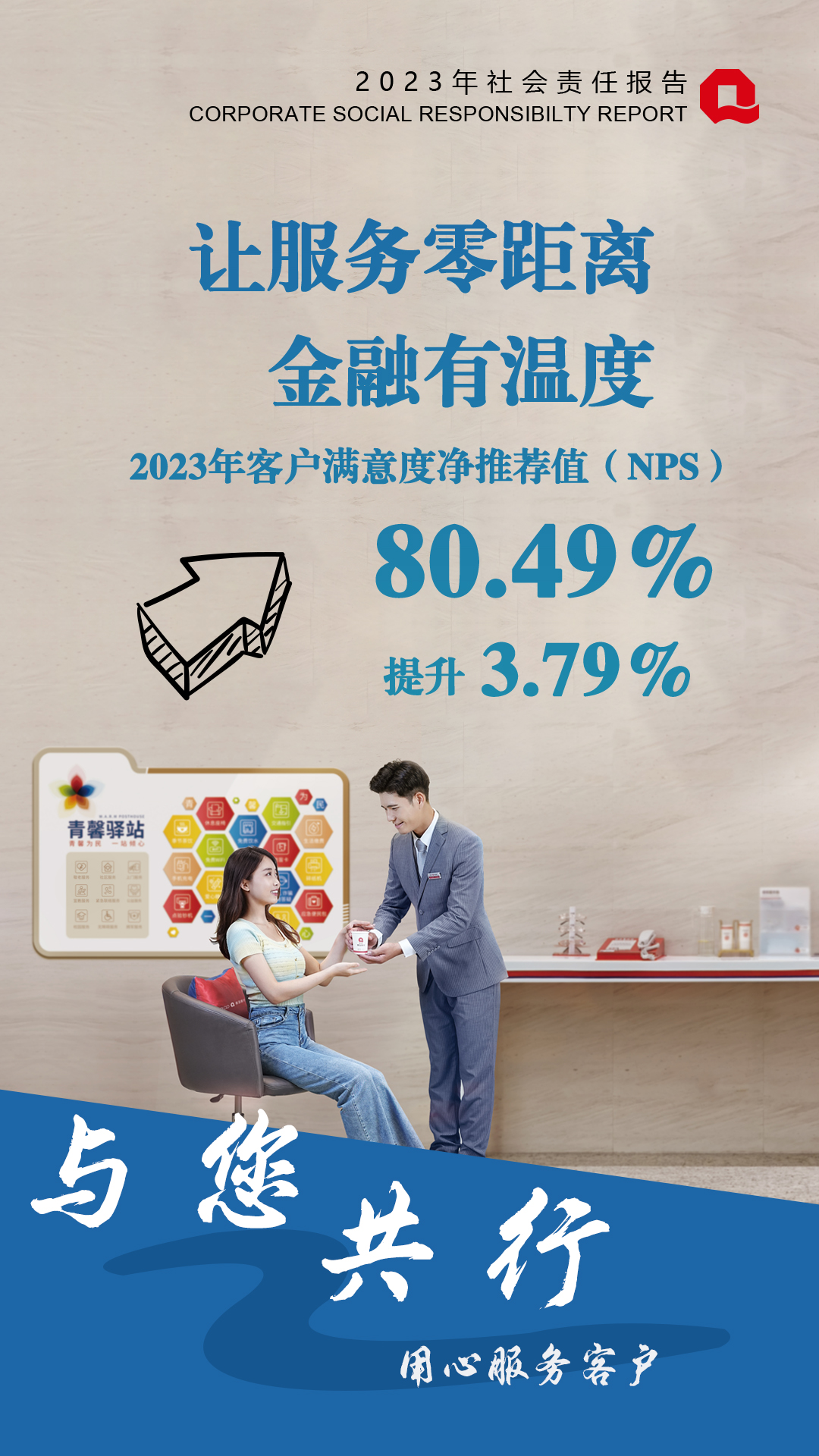 2023年,青島銀行總體客戶滿意度凈推薦值(NPS)達到80.49%,較2022年提升3.79%。